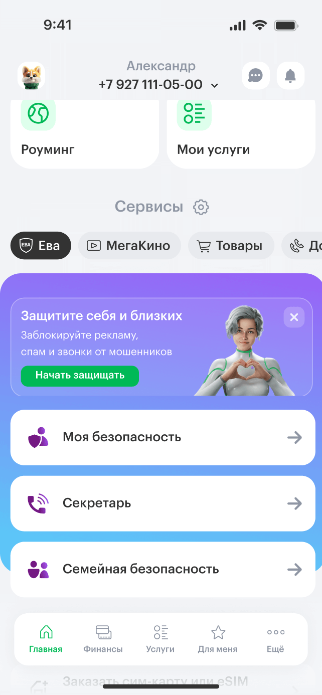 - 2На главной в блоке «Сервисы» откройте Еву и нажмите кнопку «Семейная безопасность».